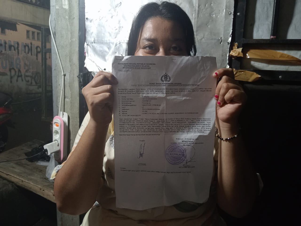 Korban telah melaporkan kejadian itu pada hari yang sama dengan nomor laporan polisi LP/B/2227/XI/2025/SPKT Polrestabes Makassar.Namun, lebih dari empat bulan sejak laporan dibuat, korban mengaku belum melihat adanya kemajuan berarti dalam proses penyidikan yang ditangani oleh jajaran reserse kriminal Polrestabes Makassar.